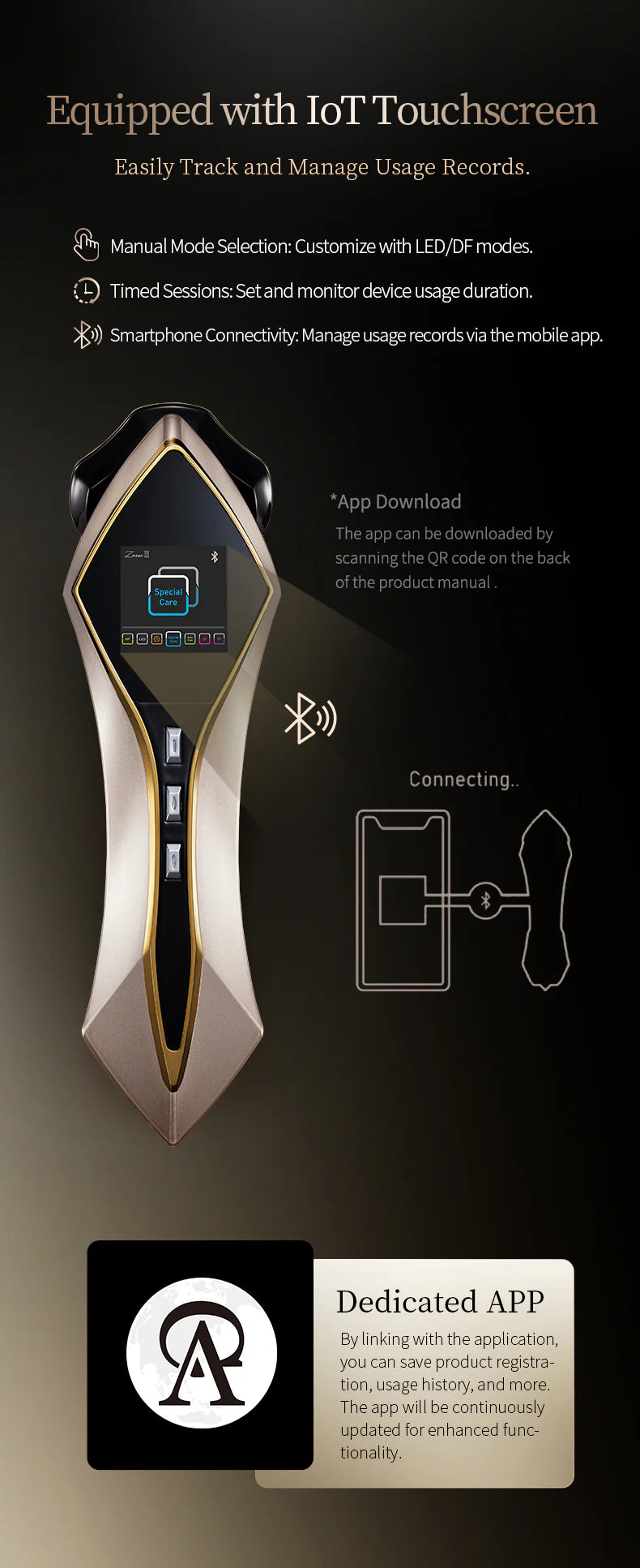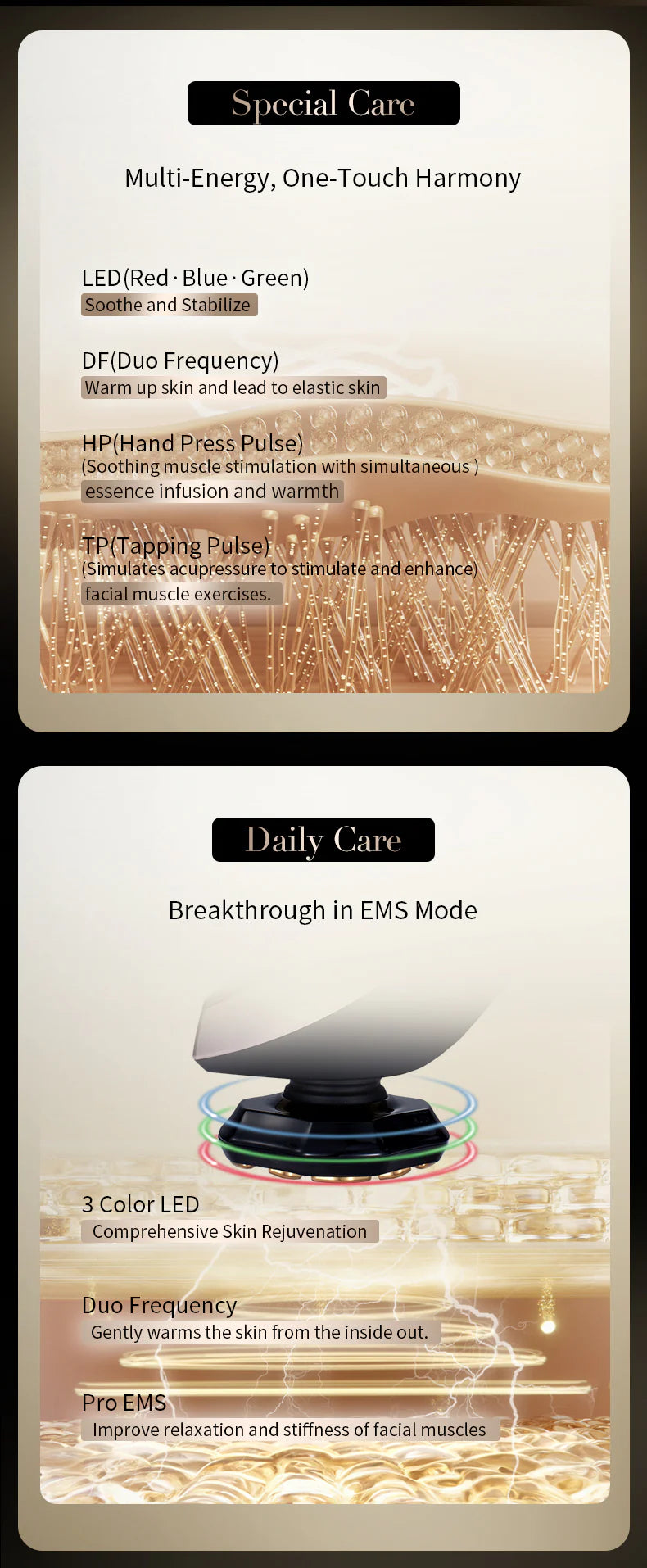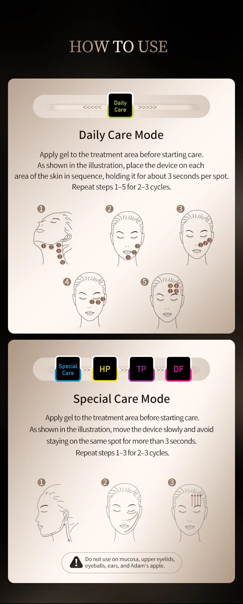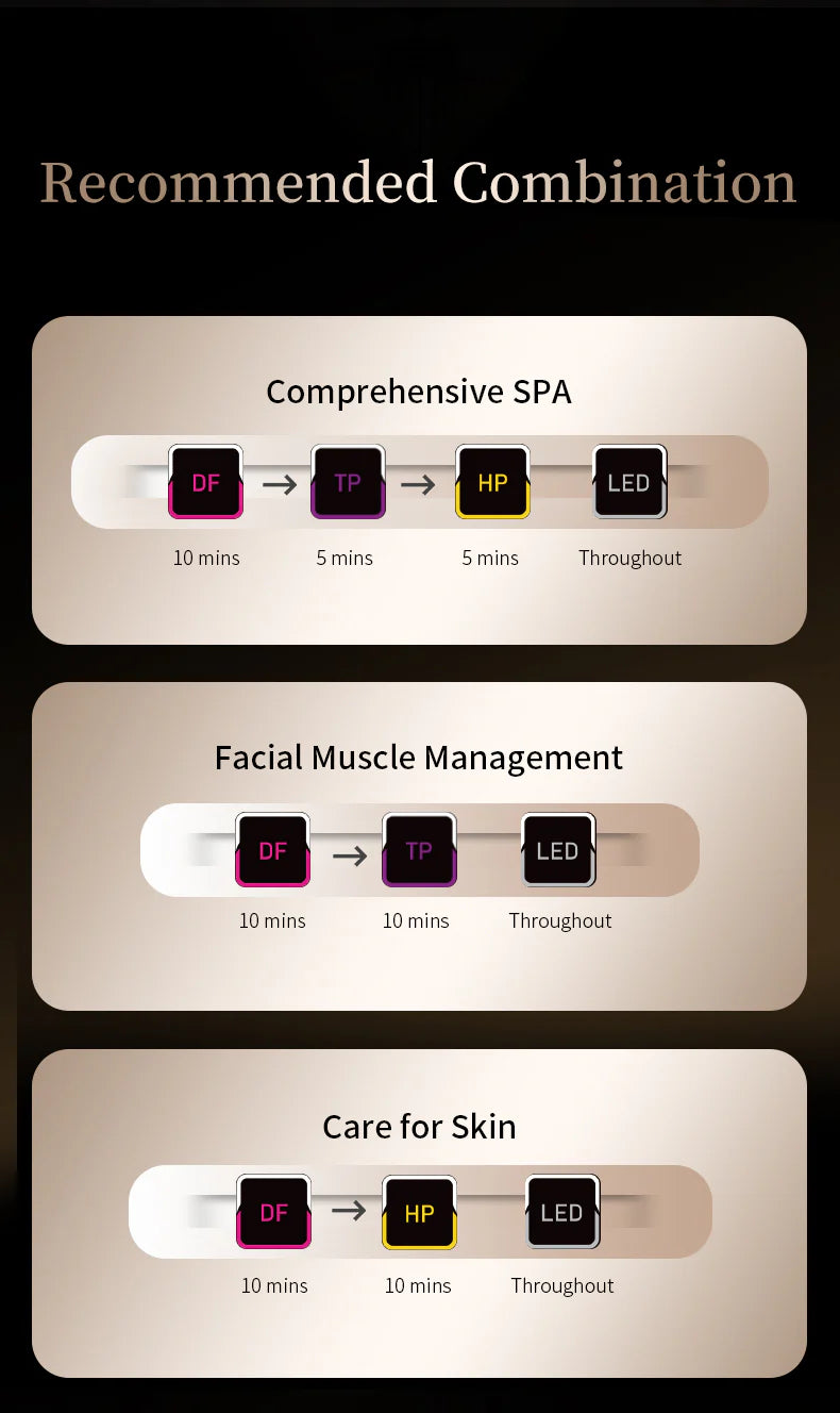 · Special care - this mode allows you to output TP, HP and RF simultaneously. This is an ideal home care regimen that provides comfortable stimulation and a warming effect. Solves skin problems using wavelengths of light - LED therapy.