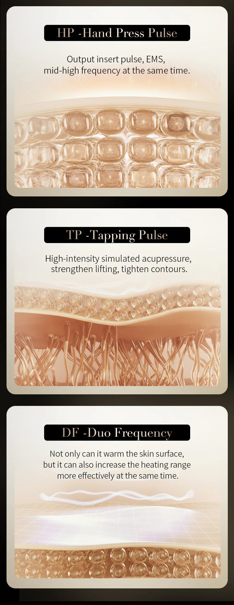 · DF (Dio Frequency) - This mode uses two different types of high frequencies to heat not only the surface of the skin, but also a wide range of areas to heat the deeper layers of the skin, making the skin even more elastic.